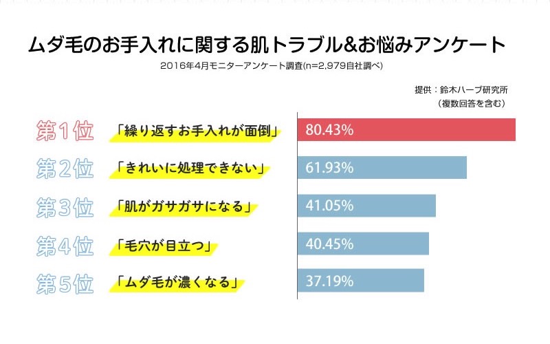 アンケートの結果、みなさん、ムダ毛ケアには、こんな悩みをお持ちのようです。